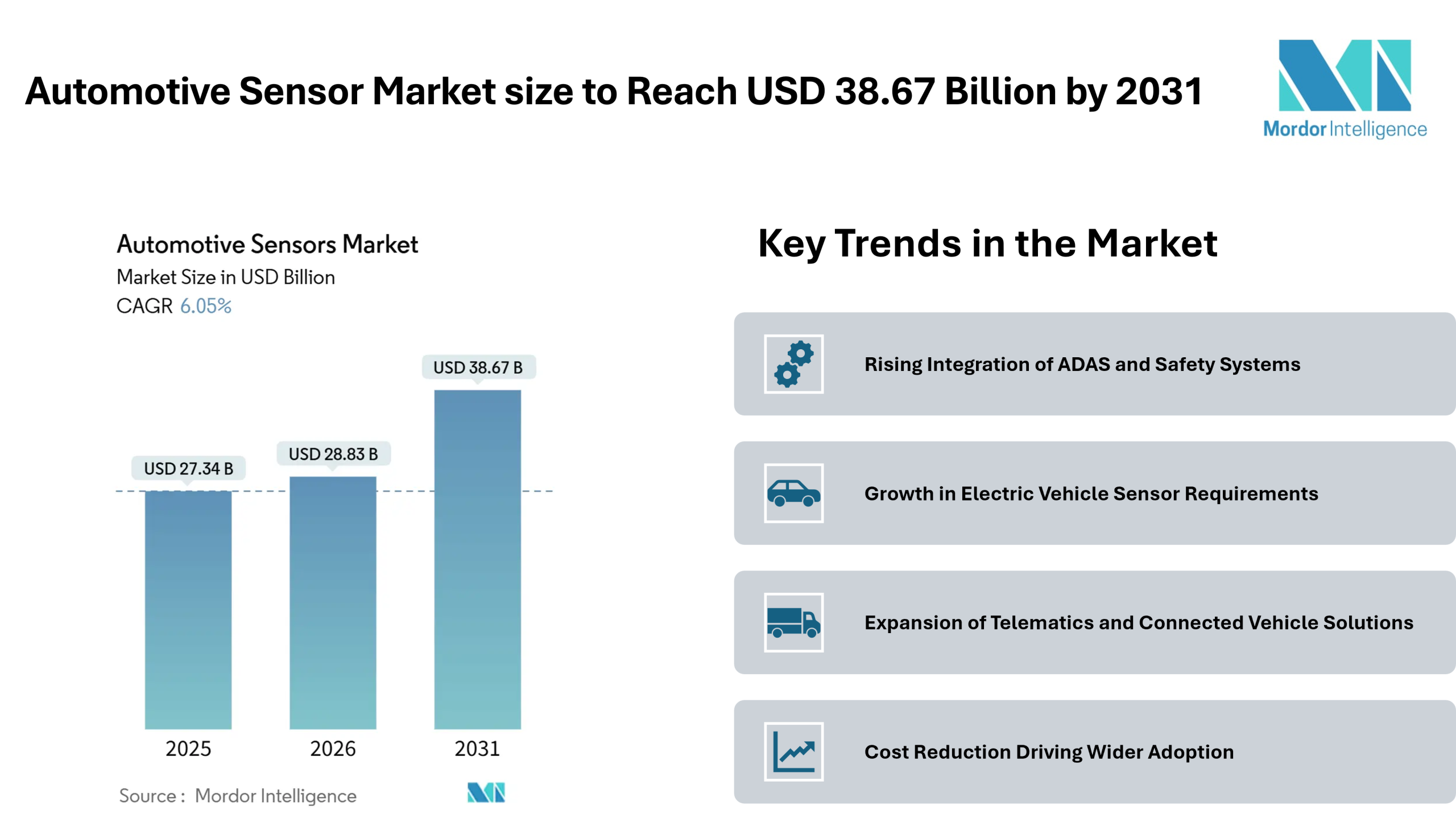 According to Mordor Intelligence, the automotive sensor market size was valued at USD 27.34 billion in 2025 and is estimated to grow to USD 28.83 billion in 2026, reaching USD 38.67 billion by 2031, registering a CAGR of 6.05% during the forecast period. This steady automotive sensor market growth reflects the increasing integration of sensors across modern vehicles, where safety, efficiency, and connectivity are becoming standard expectations rather than premium features.