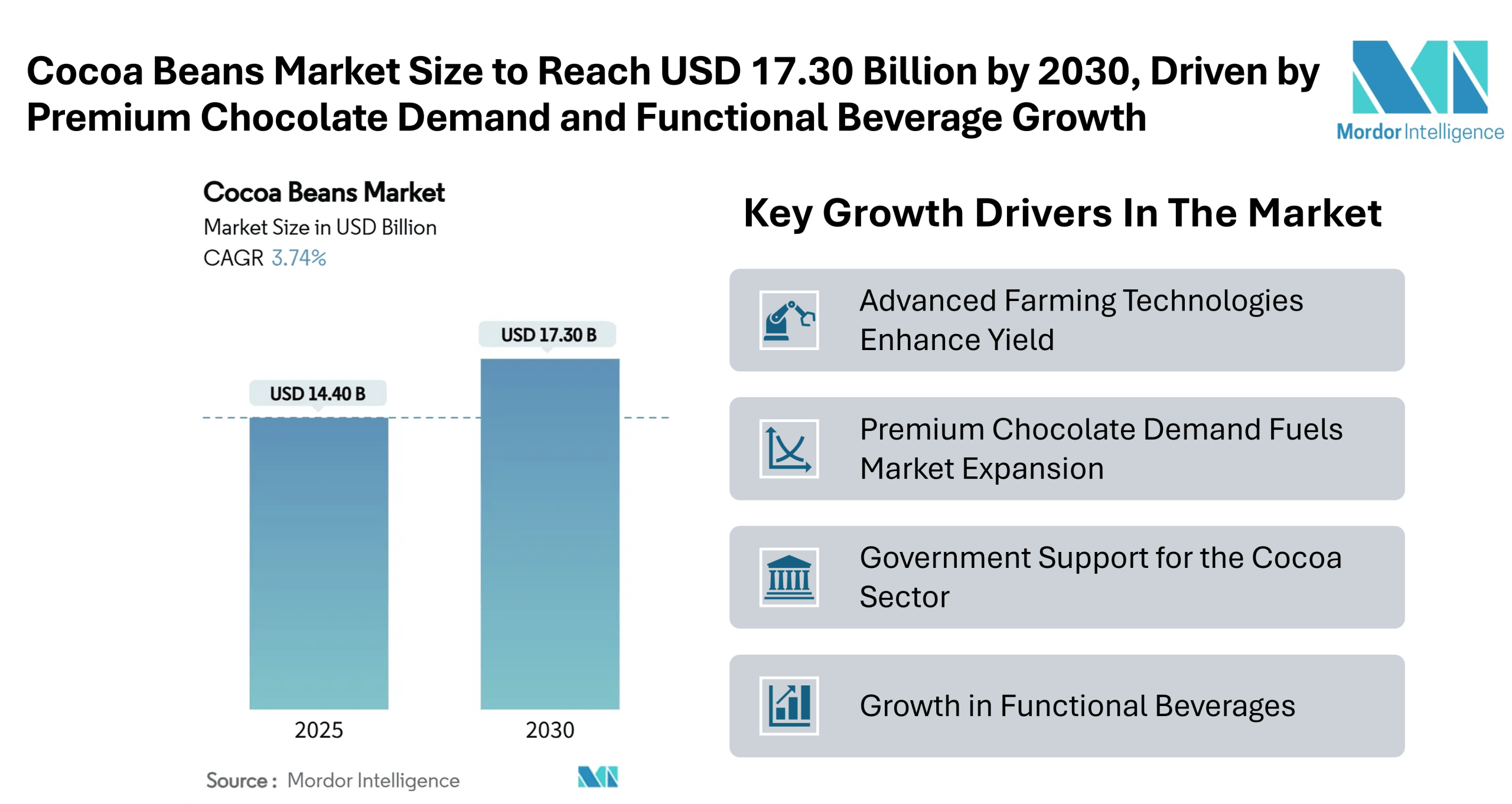 The Cocoa Beans Market size is projected to grow from USD 14.40 billion in 2025 to USD 17.30 billion by 2030, registering a CAGR of 3.74% during the forecast period (2025-2030). The market is experiencing consistent growth, driven by the rising demand for premium chocolate, innovations in functional cocoa-based beverages, and advancements in sustainable farming practices. With Europe maintaining a dominant processing footprint and North America emerging as the fastest-growing region, cocoa beans are increasingly being utilized in diversified product categories beyond traditional confectionery.