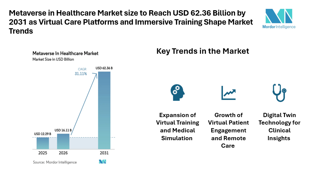 According to Mordor Intelligence, the metaverse in healthcare market size was valued at USD 12.29 billion in 2025 and is estimated to grow from USD 16.11 billion in 2026 to reach USD 62.36 billion by 2031, registering a CAGR of 31.11% during the forecast period. This expansion reflects the increasing interest in digital environments that allow healthcare professionals to interact with patients, data, and clinical tools in new ways.