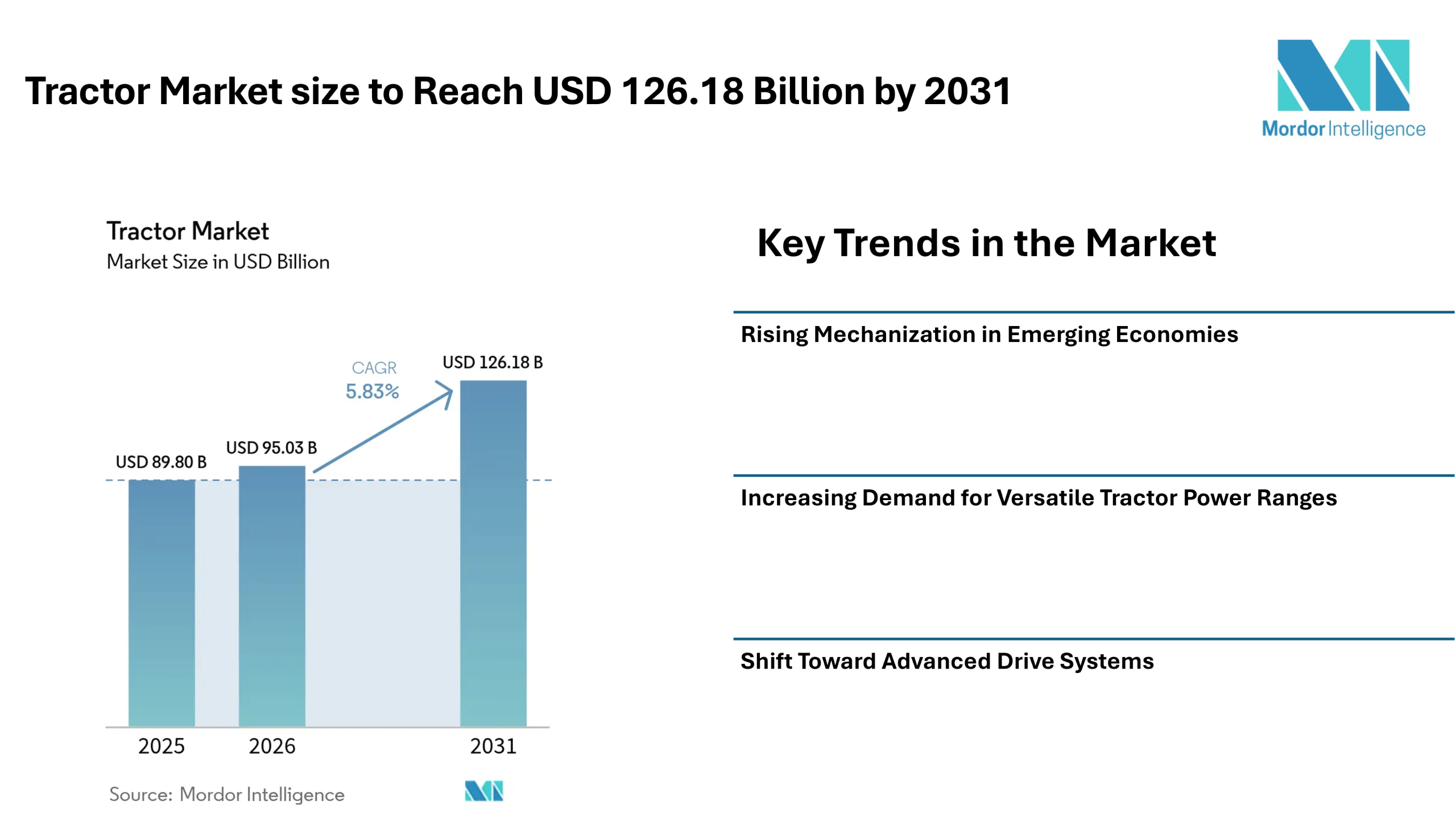According to Mordor Intelligence, the tractor market size is estimated at USD 95.03 billion in 2026, increasing from USD 89.8 billion in 2025, and is projected to reach USD 126.18 billion by 2031, registering a CAGR of 5.83% during the forecast period.