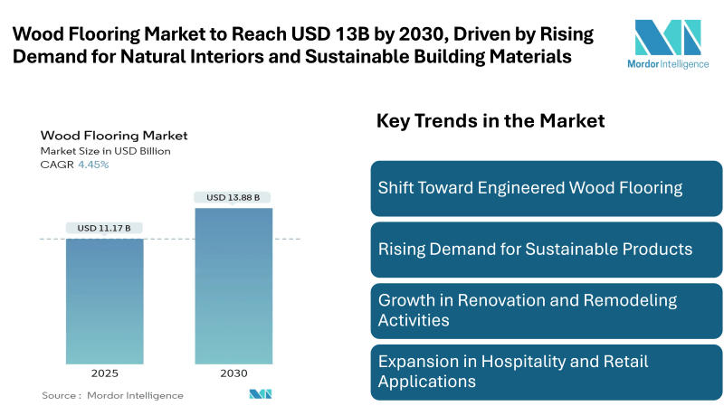 According to Mordor Intelligence, the Wood Flooring Market size is estimated at USD 11.17 billion in 2025, and is expected to reach USD 13.88 billion by 2030, at a CAGR of 4.45%, supported by consistent demand from housing renovation, new construction activity, and interior design upgrades. The market is witnessing stable expansion as consumers increasingly prefer flooring materials that combine aesthetics with durability and environmental compatibility. The wood flooring market continues to gain steady attention across residential and commercial construction due to its natural appearance, durability, and long-term value.